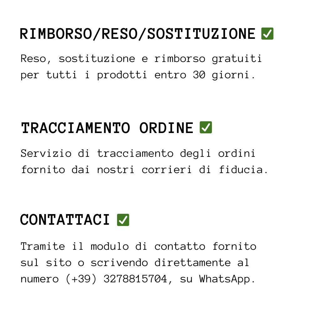 Qualora non riuscissimo a soddisfare le esigenze del cliente, è possibile effettuare un reso del prodotto a cui seguirà un tempestivo rimborso. COME FARE? Basterà semplicemente richiudere il pacco, contattarci per il reso, e attendere l'etichetta di spedizione e tutte le istruzioni per rispedire il pacco, tutto fornito da noi e a nostre spese!